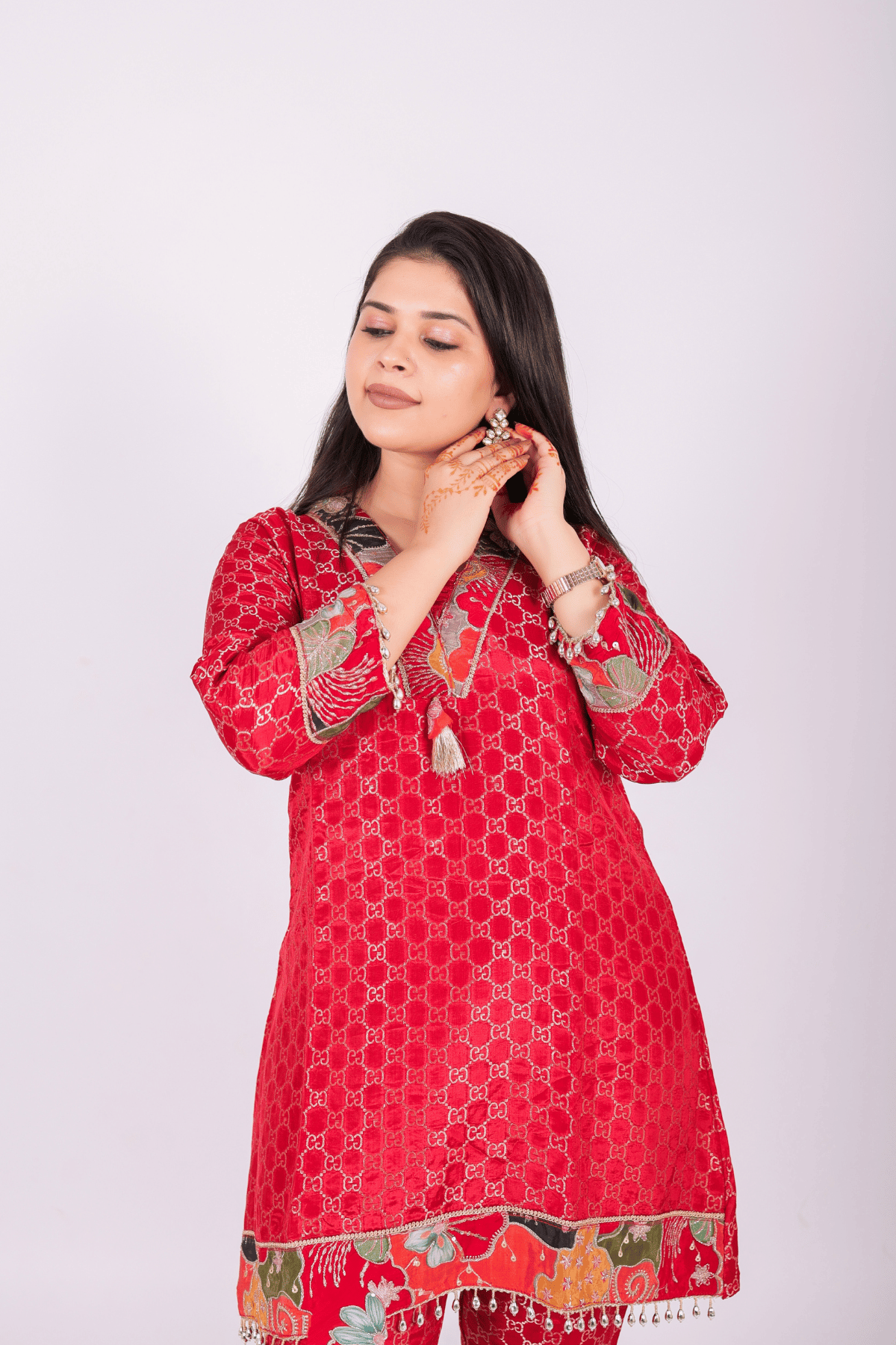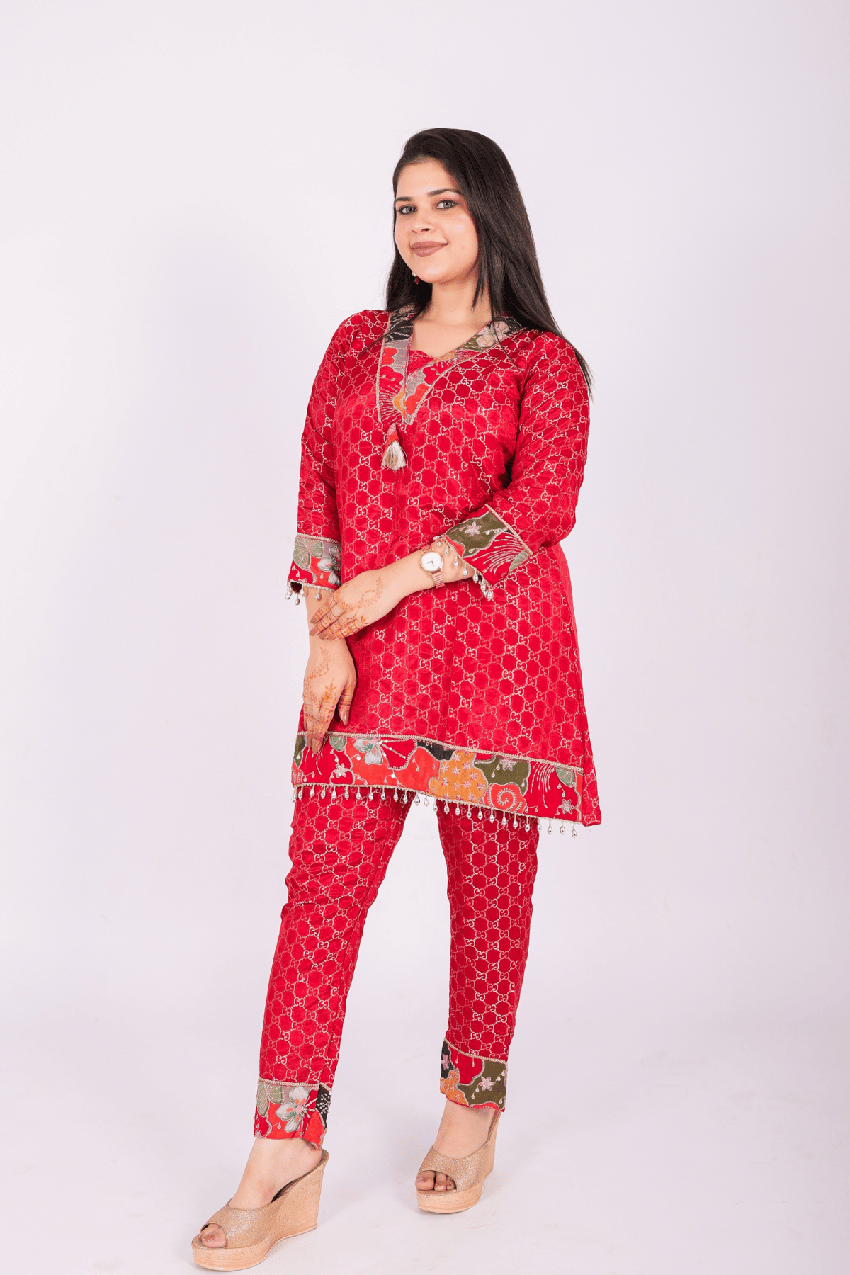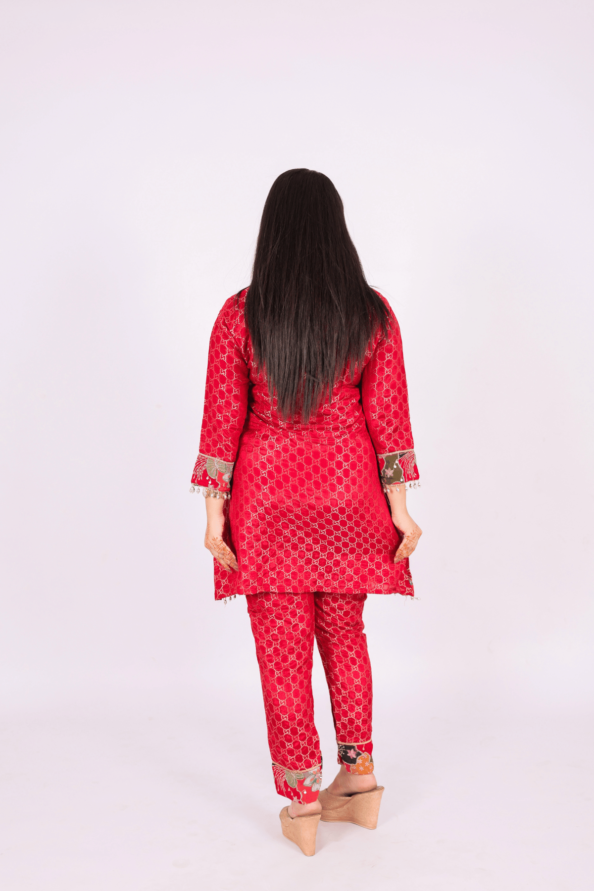 Step into effortless elegance with this vibrant Crimson Red Co-ord Set from Woven Titli. Crafted in a rich crimson red, features a sophisticated all-over geometric weave, jaal pattern that catches the light beautifully. offering a rich texture and a premium feel. The highlight of this piece is the exquisite multicolored floral-printed borders Kalamkari style-inspired border detailing on the sleeves, hemline, and ankles, adding a splash of artisanal charm. Finished with delicate pearl-drop tassels and a classic V-neckline, Paired with matching straight-fit trousers, this set perfectly blends traditional craftsmanship with a modern silhouette.