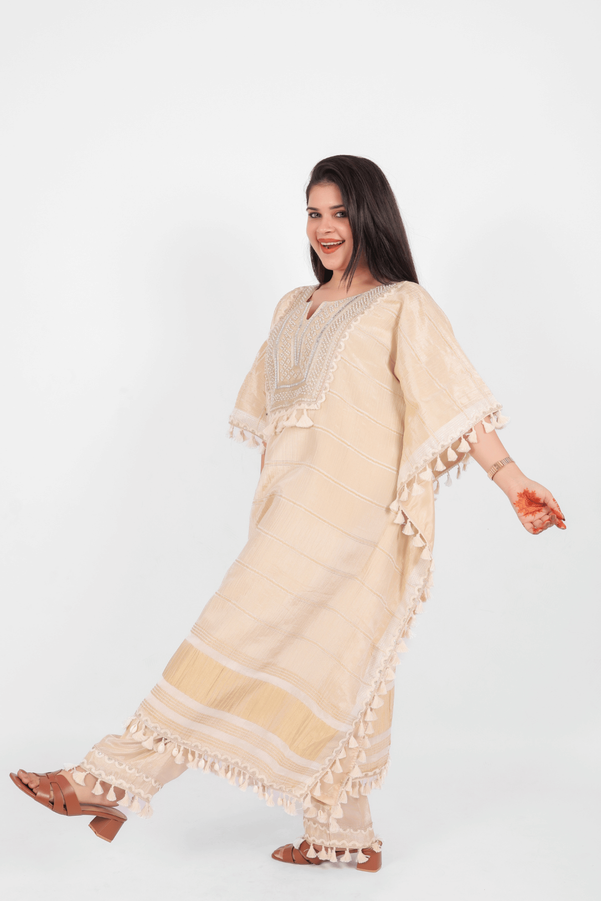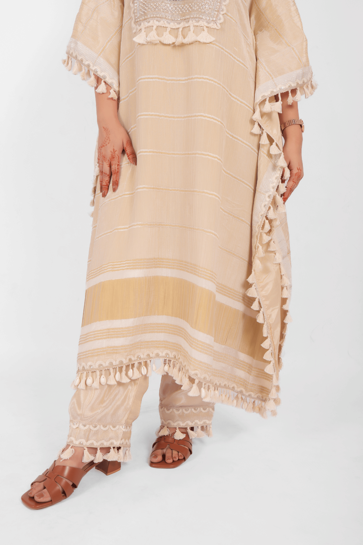 The set includes coordinated straight-cut trousers crafted with a partially elasticated waistband for a sleek yet comfortable fit. They feature a matching embroidered hemline adorned with intricate pearl work and signature tassel fringes to mirror the kaftan’s elegance. The ankle-length silhouette provides a clean, tailored finish that perfectly balances the voluminous top.