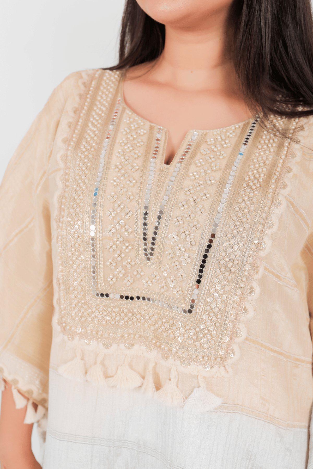 The ensemble features a sophisticated notched V-neckline highlighted by a structured, hand-embroidered yoke that adds a regal touch. It is meticulously detailed with shimmering mirror work (sheesha) and pristine pearl accents for a radiant, festive finish. The neckline is elegantly framed by a row of dainty tassel drops, seamlessly blending traditional artisanal craft with a polished, contemporary aesthetic.