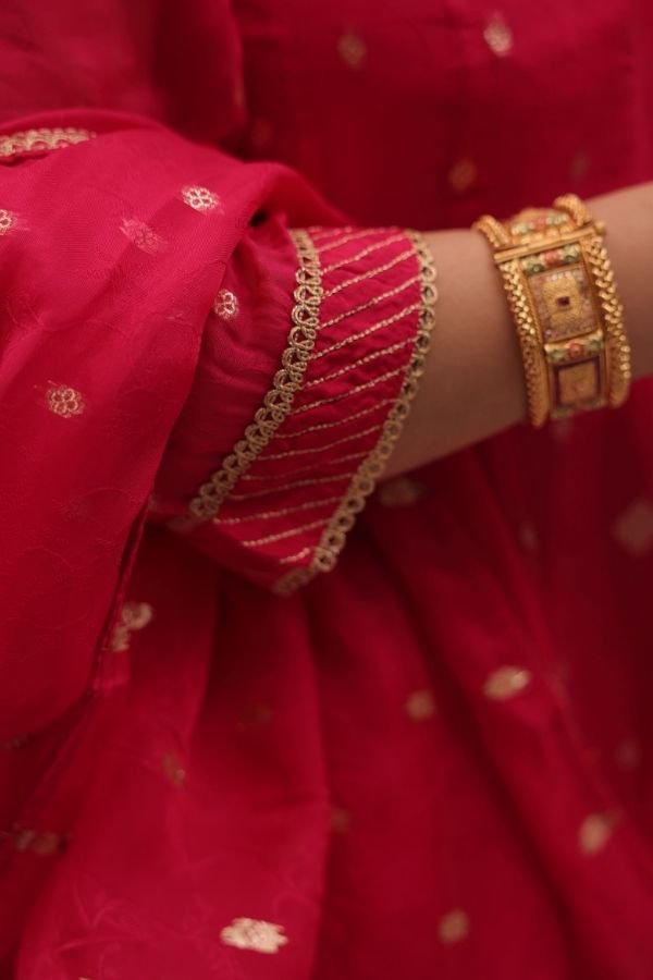 Border Detailing: Elegant Gota-Patti Lace. The sleeves and the dupatta borders are finished with traditional gold gota-patti work for a refined ethnic look.